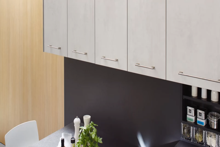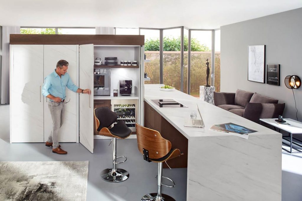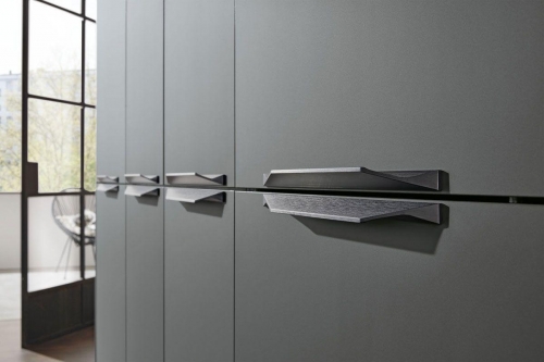 „Versteckter“ Platz durch intelligente Design-lösungen der Unter-, Insel- und Oberschränke mit integriertem Regal. Die Tür ist auf Gehrung geschnitten, die bodentiefe Front kommt ohne Sockel aus. Schrank und Regal verschmelzen zu einem Küchenelement. Hoher Wirkungsgrad bei geringem Außenraum.